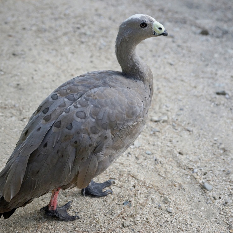 Это крупный гусь, достигающий в длину 75—100 см и весящий 3,2—6,8 кг. Окраска серая со светлыми пятнами. Голова небольшая, шея относительно короткая. Клюв желтый, короткий и высокий, у основания вздут, с загнутым черным кончиком, напоминает куриный. Длинные красные ноги с короткими черными пальцами, соединенными небольшими перепонками.