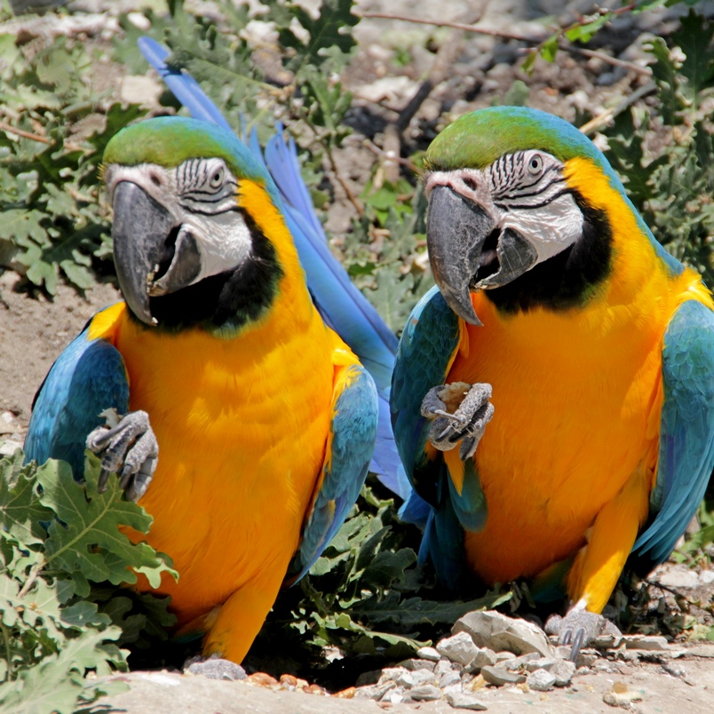 Длина тела 80—95 см, крыла — 37—40 см, хвоста — 52 см; вес 900—1300 г. Верхняя часть оперения тела ярко-голубая, бока шеи, грудка и живот оранжево-жёлтые. Кроющие перья хвоста ярко-голубые. Горло чёрное. Щёки спереди неоперённые серо-белые с чёрными полосками. Лоб зелёный. Клюв чёрный, очень сильный и способен лущить орехи, и перегрызать ветви деревьев. Ноги буровато-чёрные. Радужка соломенно-жёлтая. Голос громкий и резкий, созвучен с названием птицы.